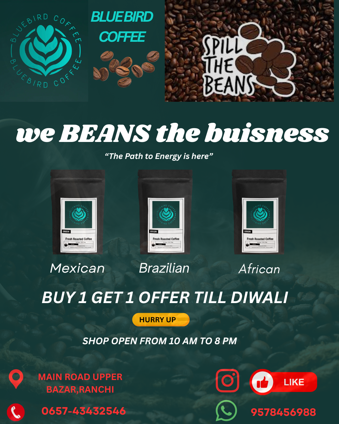 For this project, I created a festive promotional poster for Bluebird Coffee to highlight their Diwali Buy 1 Get 1 offer. The design blends bold visuals with the brand’s teal identity to create an eye-catching, premium look.