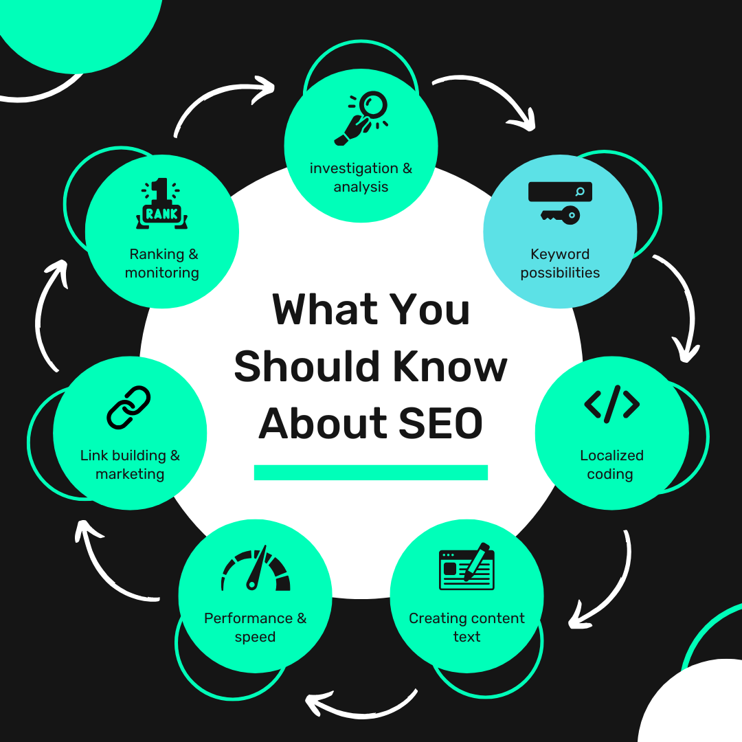 I created this modern SEO infographic using a clean circular layout to show the continuous flow of SEO tasks. The black and neon-aqua color scheme gives it a sharp, tech-focused look, while simple icons and minimal typography keep the information clear and easy to follow. The arrows guide the viewer smoothly around each element, making the design both visually engaging and highly informative..